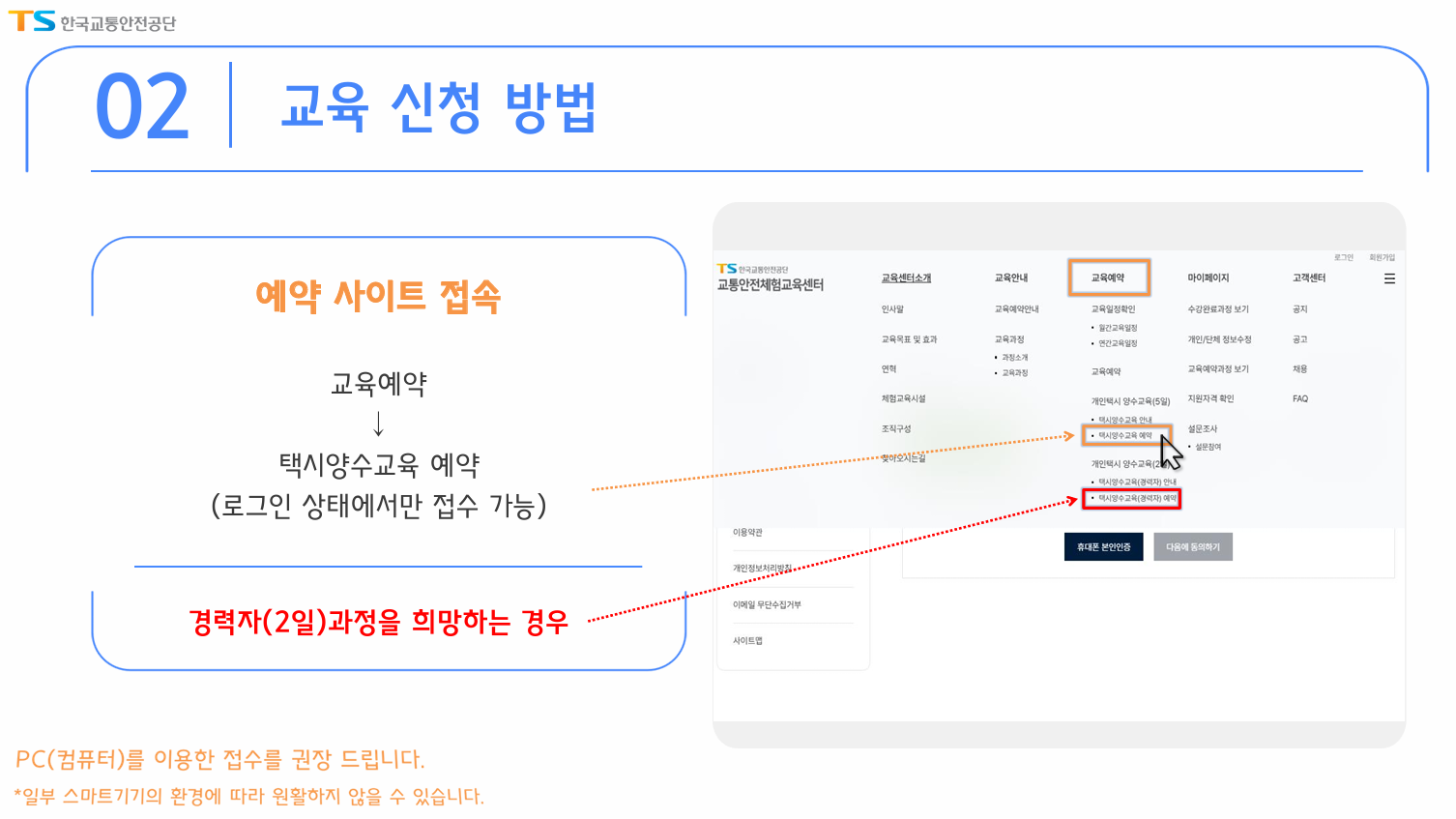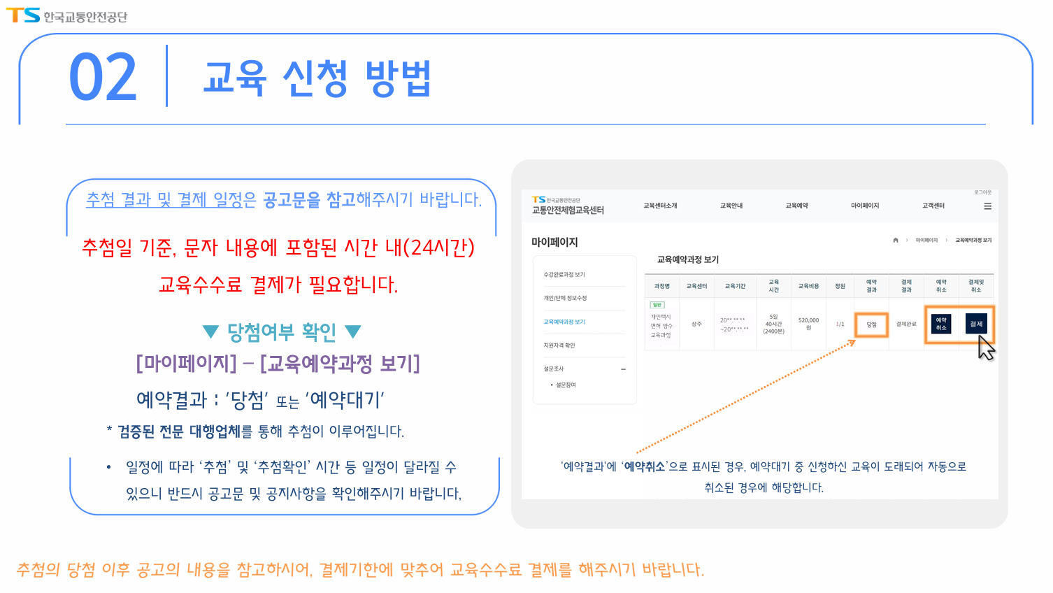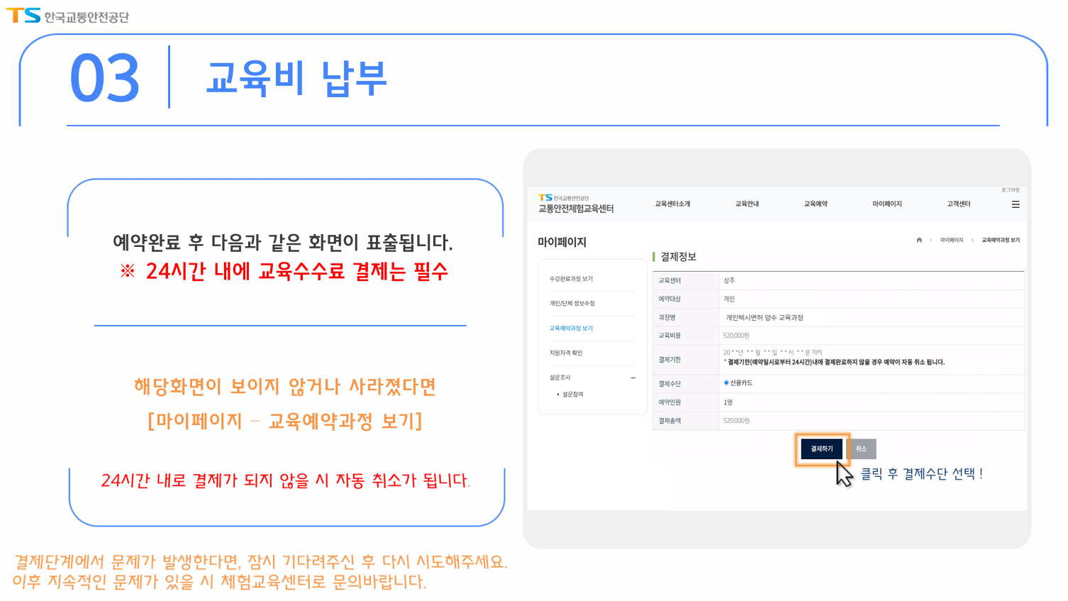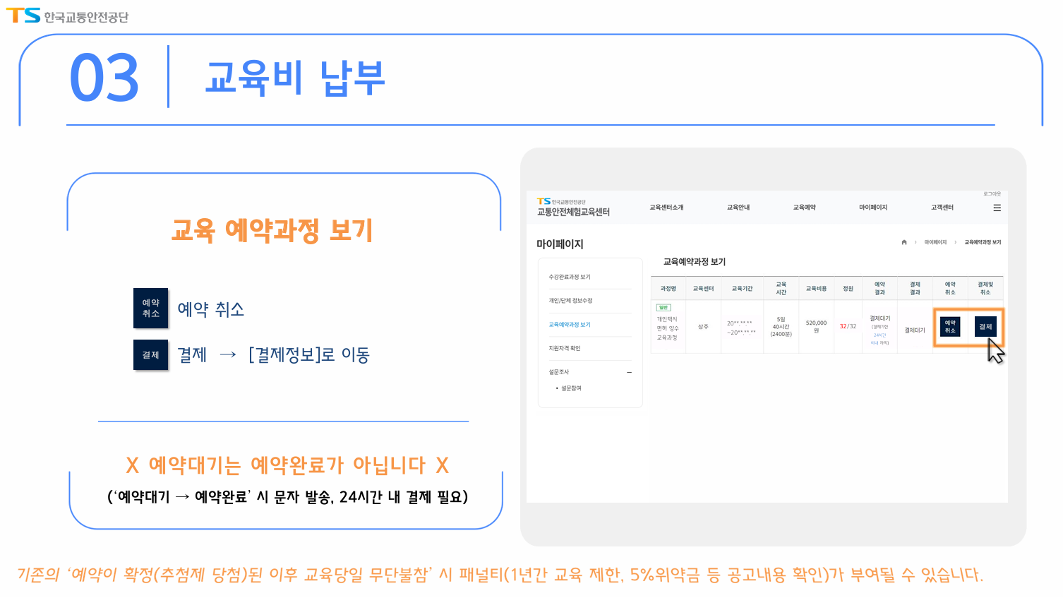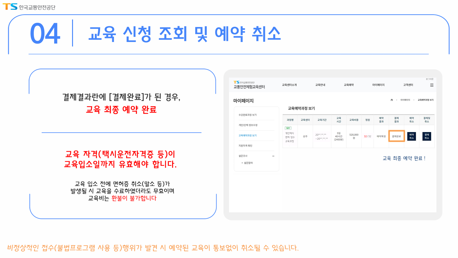(교통안전체험교육센터 홈페이지 로그인 후, [마이페이지 – 교육예약과정 보기])