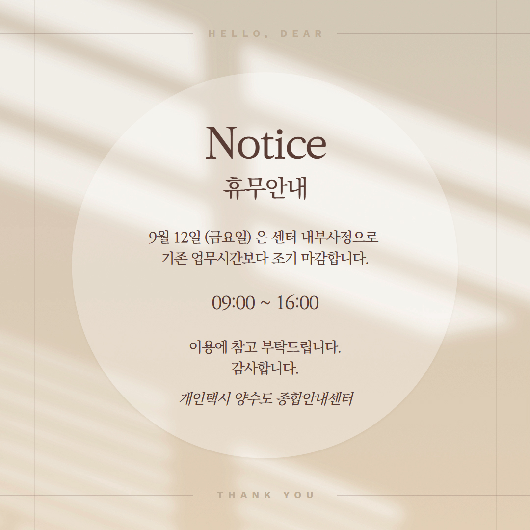 센터 내부사정으로 인해 9월 12일 (금요일) 영업시간을 기존보다 단축 영업하게 되었습니다.