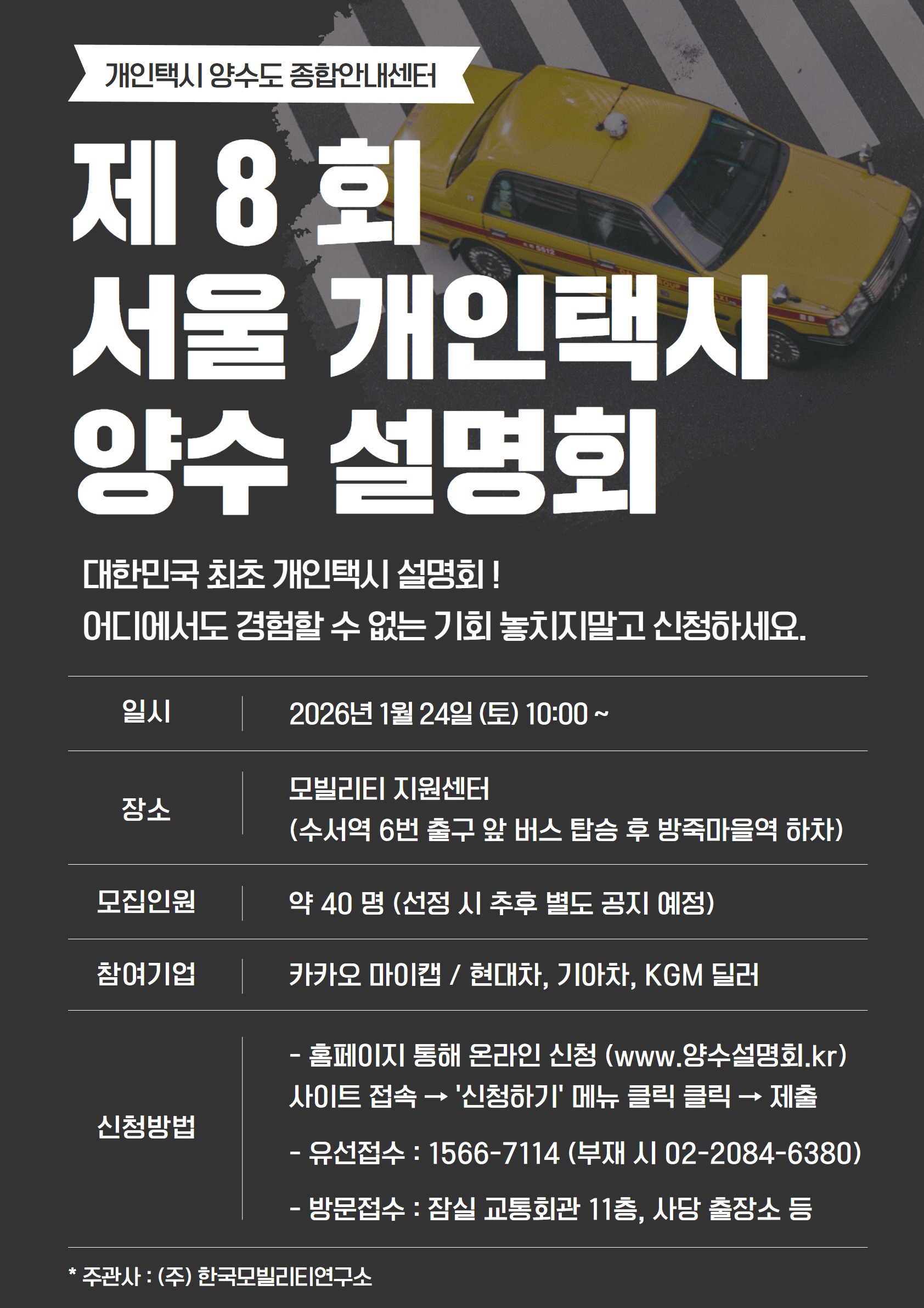 - 행사 내용 : 개인택시 양수에 필요한 모든 정보 제공 및 문의 가능한 시간